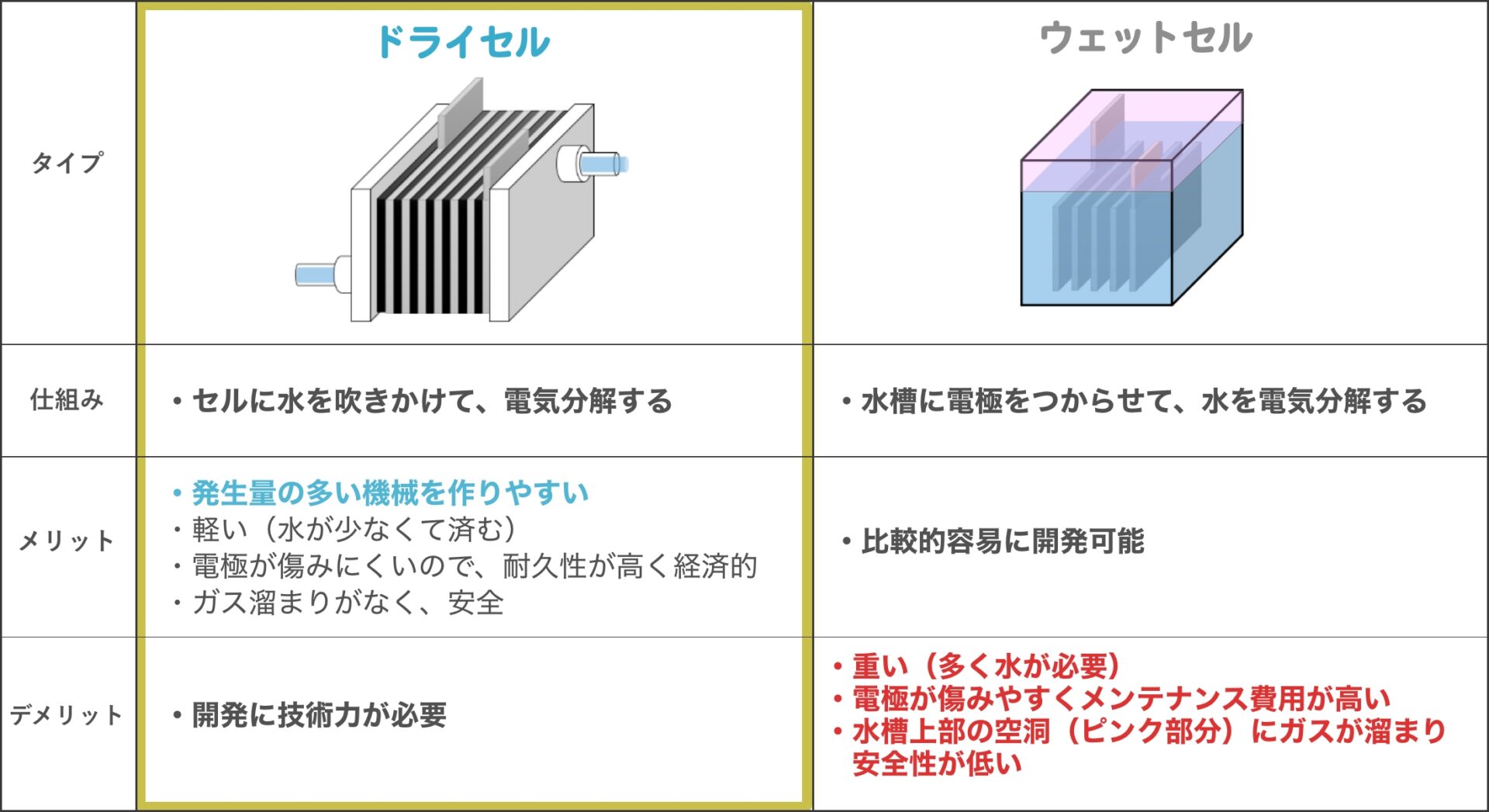 水素酸素ガス(HHOガス)を発生させる電極のセル方式は、主にドライセル方式とウェットセル方式の2種類があります。水素市場のほとんどがウェットセル方式を導入しています。以前からの研究で大量のHHOガスを発生させるにはドライセル方式が理想的と言われてきました。しかし、ドライセル方式の実現には高度な開発技術が求められるため従来の製品のほとんどがウェットセル方式を採用していました。